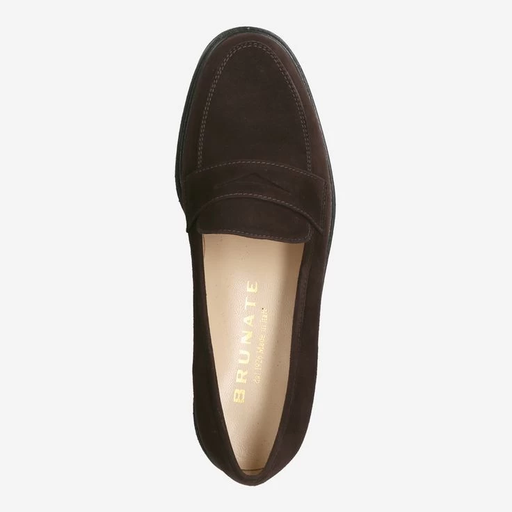 Sie wissen genau was Sie wollen! Denn Sie haben Ihren eigenen Stil, jenseits von kurzweiligen Trends. Dann ist dieser exquisite Penny Loafer ein Kandidat, der Ihnen imponieren könnte. Brunate fertigt in traditionell italienischer Handarbeit dieses Modell aus espressobraunem Veloursleder. Die markante Lederapplikation am Spann zeichnet den Meilenstein optisch aus. Früher hat man darunter einen Penny gesteckt, als Zeichen für Glück und Wohlstand.