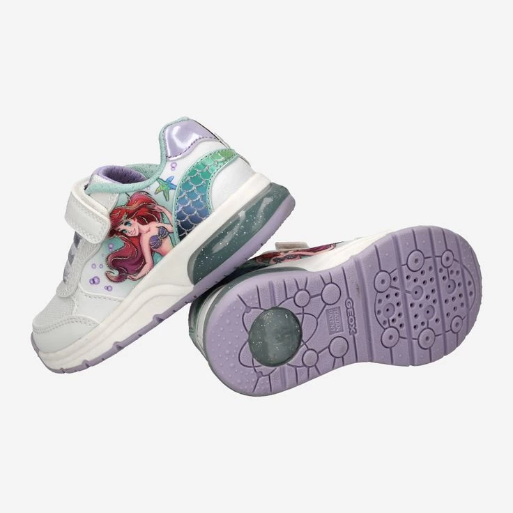 | Merkmale | Wechselfußbett, für Einlagen geeignet, Innensohle aus chromfrei gegerbtem Leder (atmungsaktiv, stoßdämpfend, antibakteriell) / individuell anpassbar, Klettverschluss, Logoapplikation, Logoprägung, Ziernähte, Gummischnürung (fest vernäht), mit Blinkfunktion in der Sohle, aus der Disney® Kollektion mit „Arielle die Meerjungfrau“ Motivdruck und Flossenapplikation in 3D |