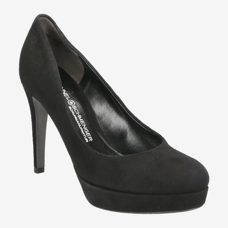 Ein Klassiker, der endlos lange Beine zaubert, sind diese schwarzen Pumps aus Veloursleder von der Exklusivmarke Kennel & Schmenger. Innen vollständig mit feinstem Leder ausgekleidet sowie mit einer robusten, ebenfalls aus Leder gefertigten Sohle versehen, bieten sie ihrer Trägerin Komfort auf höchstem Niveau. Die rund 20 mm hohe Plateausohle sowie der rund 105 mm hohe Absatz setzen Beine perfekt in Szene.