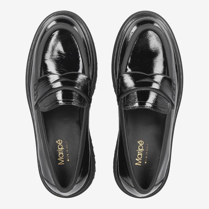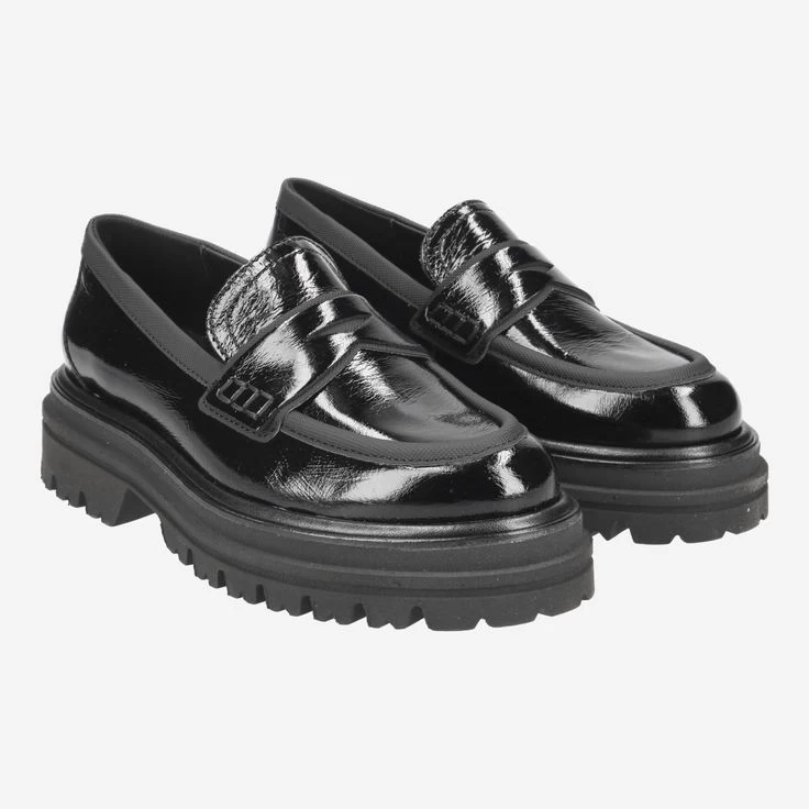 | Merkmale | Obermaterial in Lackleder in Knautschlack-Optik (flächige, feine Faltenstruktur garantiert optimale Flexibilität und verhindert harte Knickfalten), Blockabsatz, Plateausohle 30 mm, Loaferapplikation, Cut-out, atmungsaktiv |