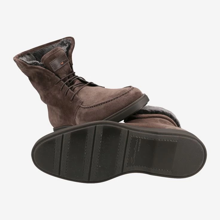 Mit einem SANTONI tragen SIe mehr als einen edlen Schuh. Sie sind Teil der SANTONI Familie! Sie verkörpert Werte wie Familiensinn, Liebe zu Tradition und Wertschätzung von Handarbeit. Die italienische Seele trägt jeder Schuh in sich. Jeder ist handgearbeitet und duftet nach feinstem Leder. Dieser Winterboot ist aus espresso-braunem Veloursleder gefertigt. Ein dickes, kuscheliges Innenfutter aus 100% Schaffell schenkt Ihnen warme Füße. Der Schaft wird umgeklappt getragen, kann jedoch auch aufgestellt werden. Dadurch können Sie diese an sehr kalten Tagen auch unter die Hose stecken oder darüber tragen. Lifestyle und Seele – ein italienisches Dreamteam!