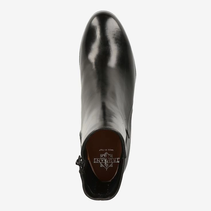 Im Stil klassischer Chelsea Boots präsentieren sich diese exklusiven Stiefeletten von Trumans, die aus weichem schwarzen Glattleder gefertigt sind. Während die Decksohle vollständig aus Leder besteht, ist das Futter zur Hälfte aus Textil gefertigt. Ein praktischer Reißverschluss sorgt für einen leichten Einstieg, weiterhin gewährleistet der Stretcheinsatz im rund 19 cm hohen und regulär 24 cm weiten Schaft einen optimalen Sitz. Ein Höchstmaß an Stabilität verspricht zudem die Gummi-Leder-Sohle mit ihrem etwa 45 mm hohen Blockabsatz.